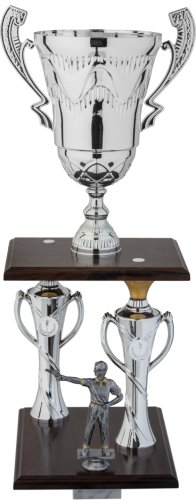 Tazza in metallo, gambo in plastica, basi in legno e marmo - colore Argento - Figura sportiva non compresa, per la personalizzazione di questo prod. si consiglia l'utilizzo di una targhetta in all. fino a cm. 10X4 da apporre sulla base con l'utilizzo di